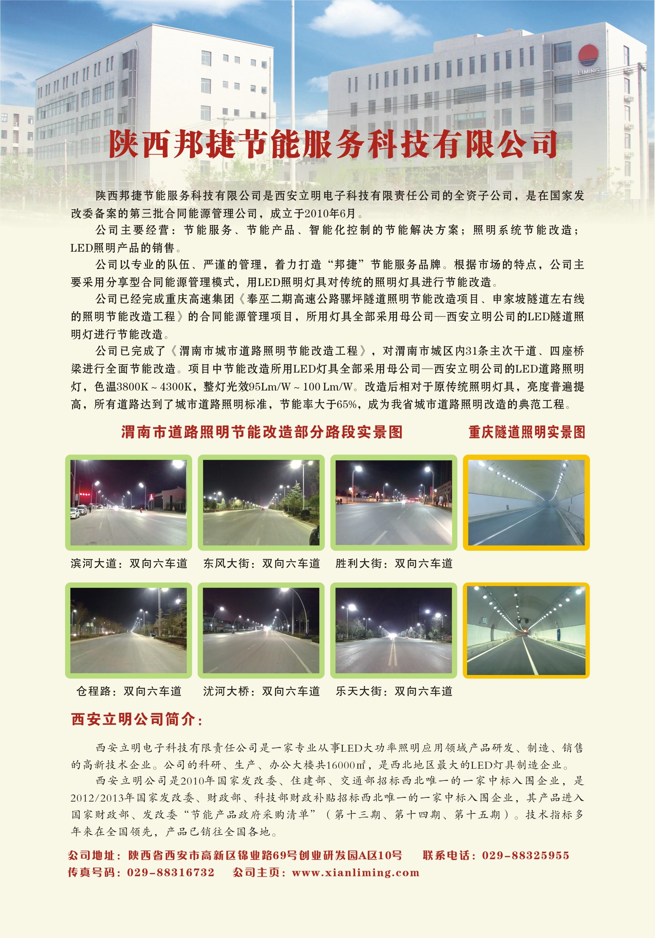 西安立明電子科技有限責任公司的全資子公司——陜西邦捷節能服務科技有限公司,是國家發改委備案的合同能源管理公司,對渭南市5917盞高壓鈉燈進行了全面節能改造,改造中所用LED燈具全部為西安立明公司生產;邯鄲市以合同能源管理模式(EMC)改造的12條道路共計7316盞燈具,全部采用西安立明公司研發生產的LED道路照明燈。 2025年8月9日 星期六