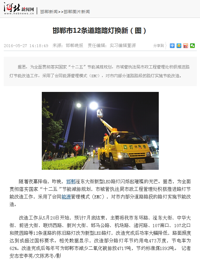 邯鄲市以合同能源管理模式(EMC)改造的12條道路是采用西安立明公司研發(fā)生產的LED道路照明燈,本次共計改造高壓鈉燈7136盞。改造完成后燈具功率大幅度降低,路面照度達到或超過國家標準。