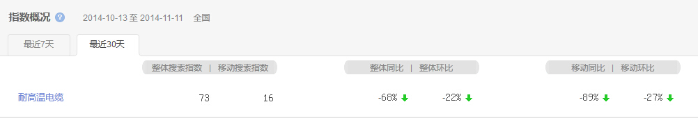 耐高溫電纜有限公司訊:隨著冬季的來臨,氣候變冷,線纜行業也隨之出現相應的變化。根據百度最新關鍵詞指數反饋的數據顯示,耐高溫電纜的需求趨勢正逐步下滑。從遠洋集團訂單數量也顯示,耐高溫電纜的需求正不斷下滑。下面我們介入百度指數的趨勢圖: